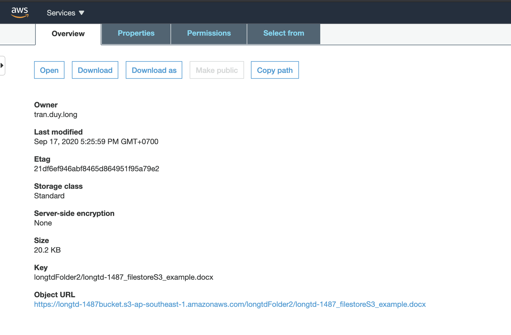- Sau khi tạo xong file, bằng cách click vào trực tiếp file, AWS cung cấp cho chúng ta một Object URL để có thể download được file này