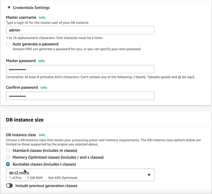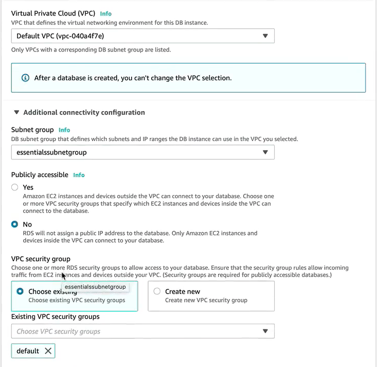 - Network và Security: Chọn private subnet group, không sử dụng default, set Public Accessible về No