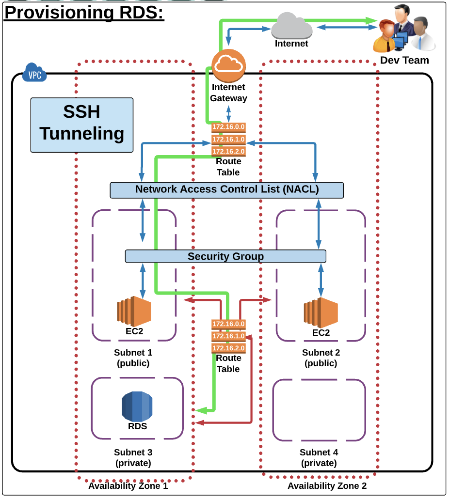 Mục tiêu chính là để cho dev team connect tới EC2 Instance, và chỉ trên EC2 Instance có quyền truy cập vào RDS trong private sub-net còn EC2 instance thì nằm trong public subnet và dev team chỉ có thể connect vào RDS thông qua các lệnh SSH như sau: