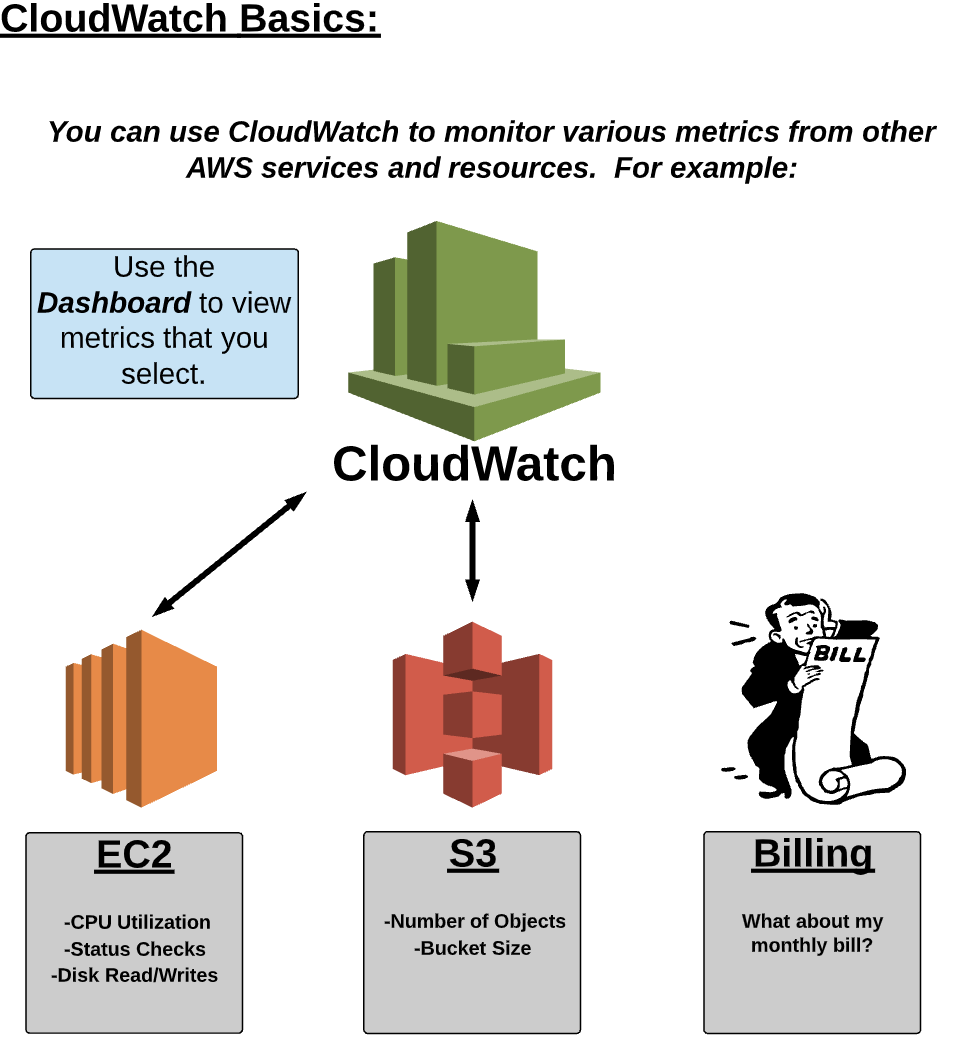 - CloudWatch là một service cho phép người dùng giám sát hàng loạt các thuộc tính của AWS Account