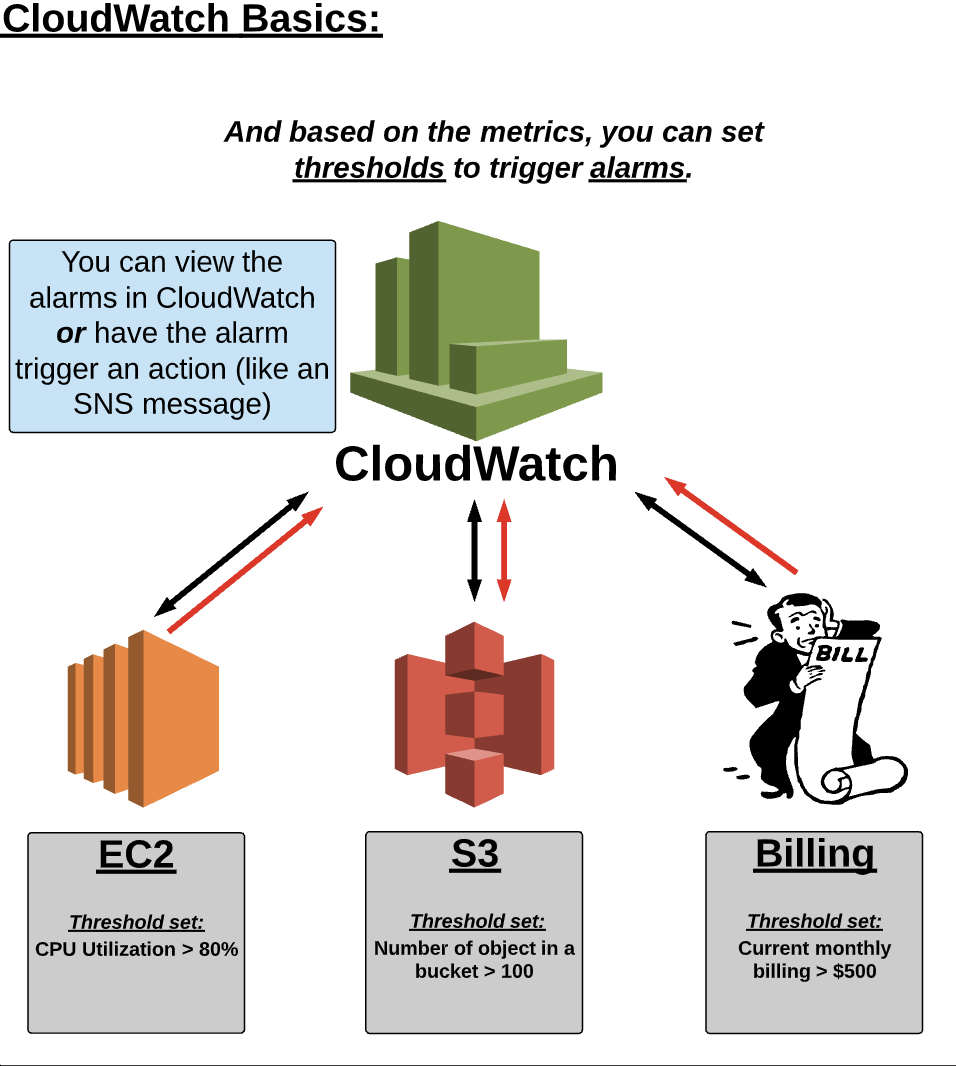 - CloudWatch còn có setting Alarms gửi notifications hoặc tự động setting các thay đổi trên resource người dùng đang giám sát dựa trên các rules người dùng định nghĩa từ trước.