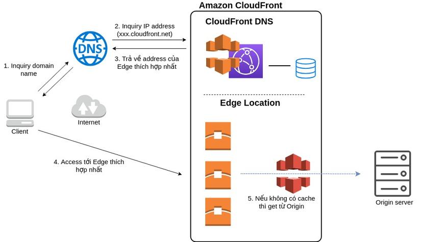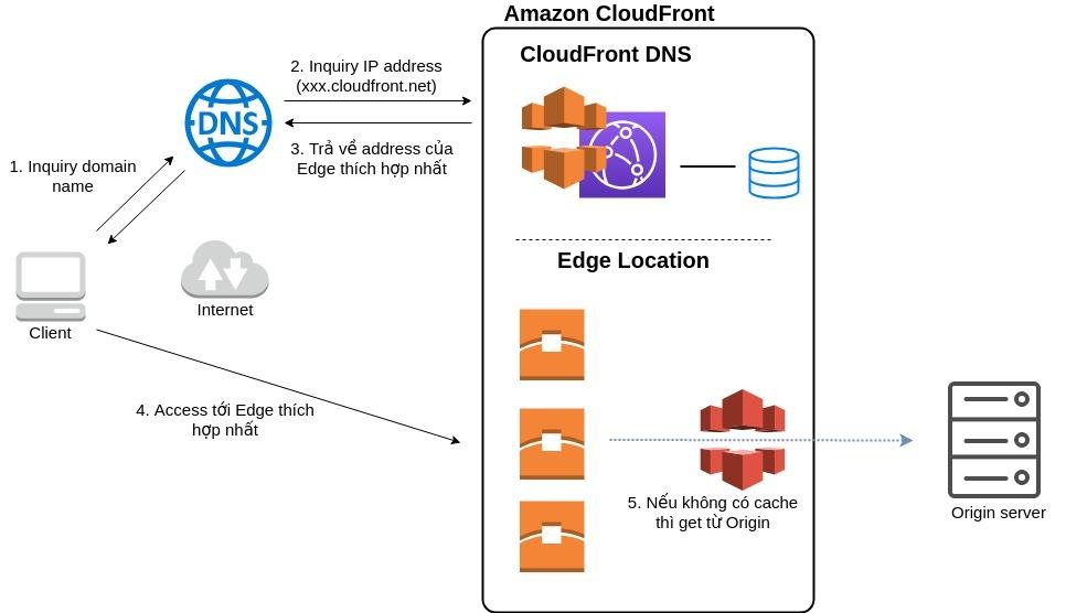 Nếu user access vào domain của CloudFront, CloudFront DNS sẽ trả về ID address của Edge server gần user đó nhất. Do Edge server được lắp đặt ở khắp thế giới, nên user access vào IP address đó thì có thể được nhận thông tin từ Edge server rất nhanh.