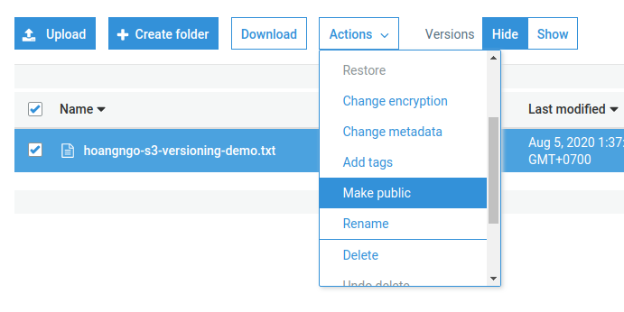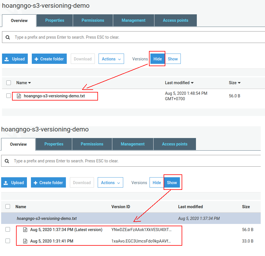 - Sau khi upload version mới lên, nếu ở phần versions đang để chế độ là Hide thì chưa thấy gì thay đổi nhiều (time modified thì có). Nhưng khi click vào show thì có thể thấy được 2 version với Version ID khác nhau được hiển thị. Ngoài ra version mới được upload lên sẽ được setting làm Lastest Version