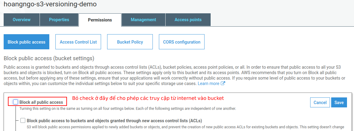 - Cho nên việc đầu tiên cần làm (để phục vụ cho việc demo view file thuận lợi) đó là thay đổi permissions setting của bucket này.