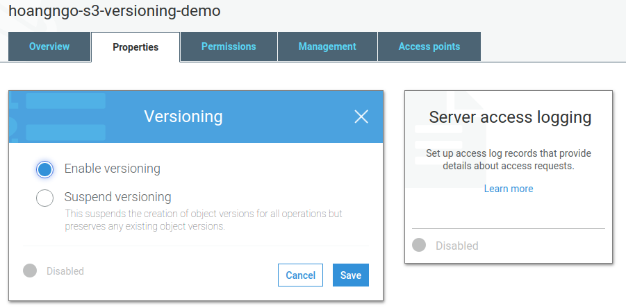- Việc tiếp theo - quan trọng nhất trong bài lab này đây, đó là setting cho bucket ở trạng thái Versioning. => Click vào tab Properties của bucket -> click vào chức năng Versioning -> Chọn vào Enable versioning.