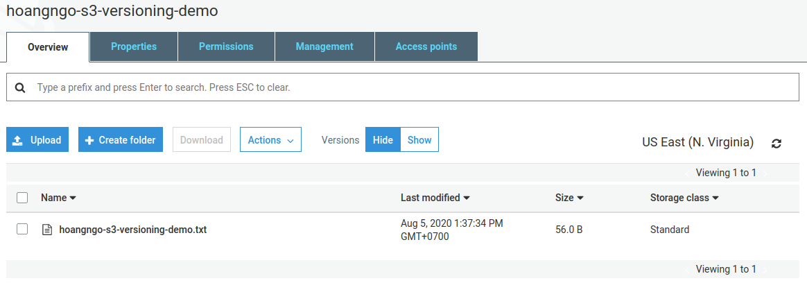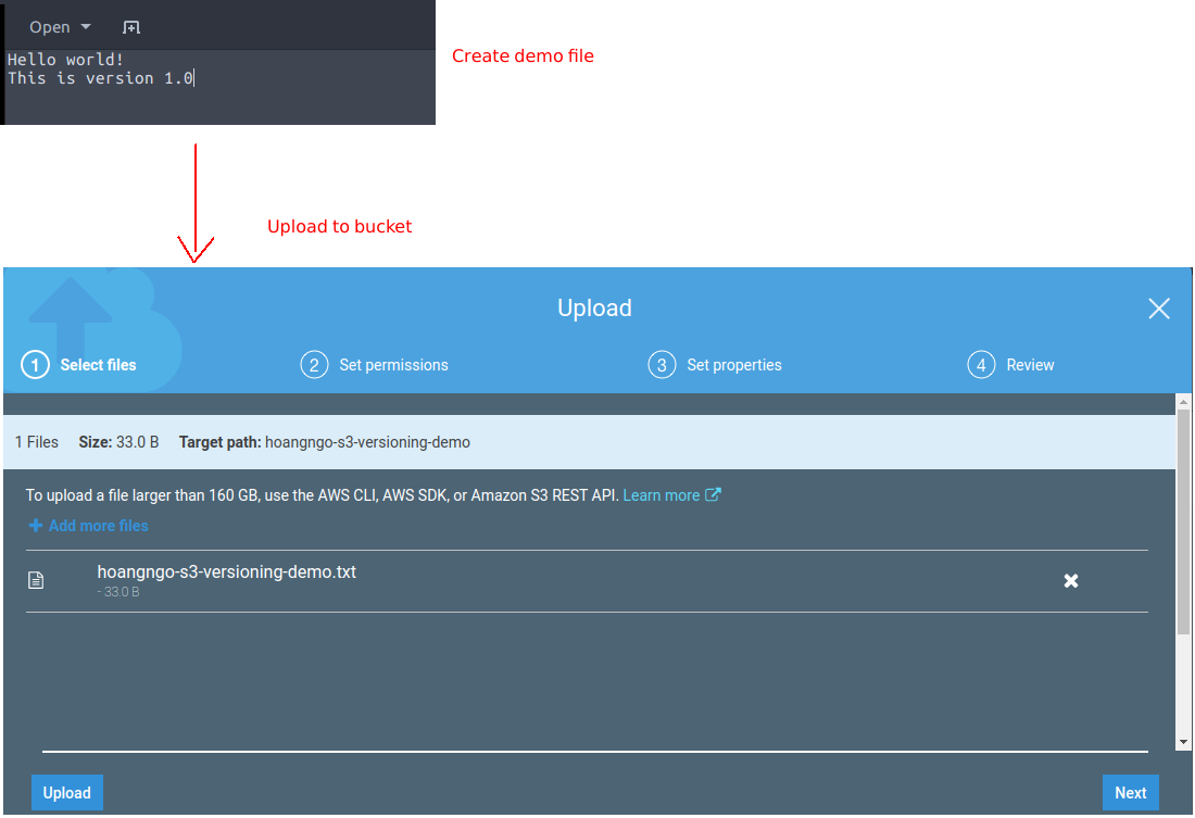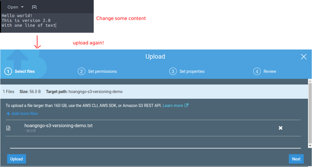 - Bây giờ mới tới phần chính yếu. Thử change content của file txt đã tạo và upload lên 1 lần nữa (tất nhiên vẫn giữ nguyên file name để bucket hiểu rằng mình đang upload cùng 1 file)
