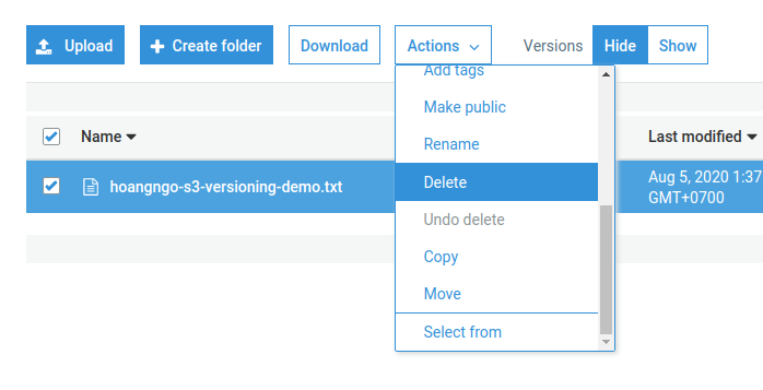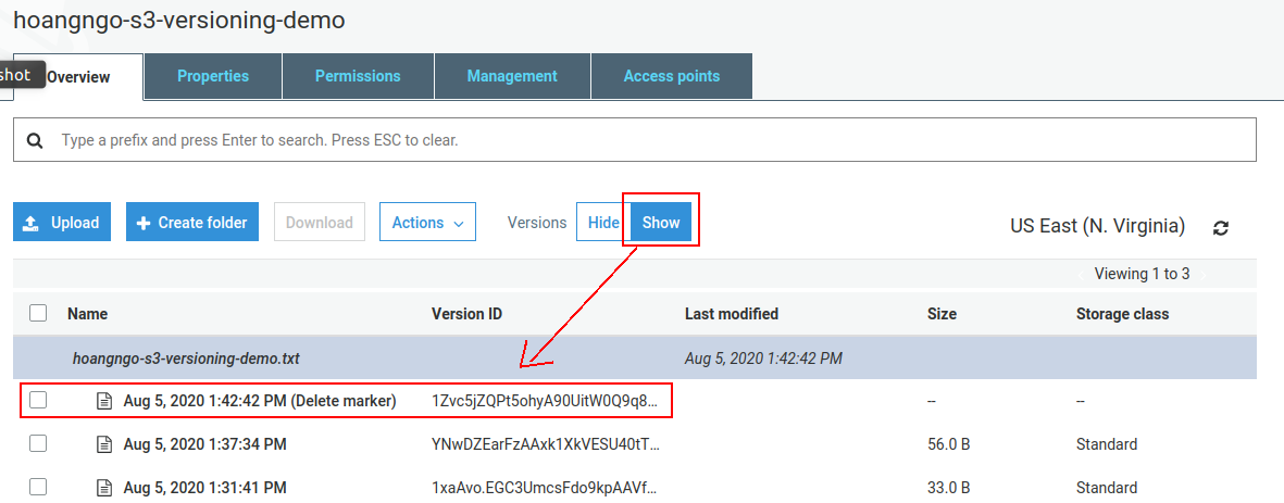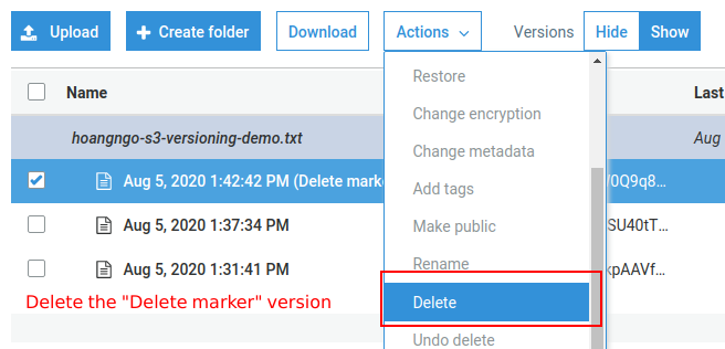 - Vậy thì bây giờ nếu muốn khôi phục lại trạng thái trước khi delete, đơn giản chỉ cần xóa đi cái version (Delete marker) đi là được.