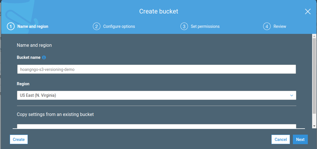 - Việc tạo mới 1 bucket thì không có gì phải bận tâm nhiều, trước mắt, chỉ cần nhập 1 valid name, chọn đại 1 region rồi nhấn create luôn - khỏi nghĩ. (Các config tính sau)