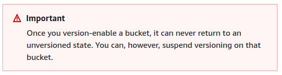 Chú ý 1: Một khi đã enable chức năng versioning của 1 bucket lên thì không thể disable nó được nữa. Mà chỉ có thể dừng - suspend nó thôi