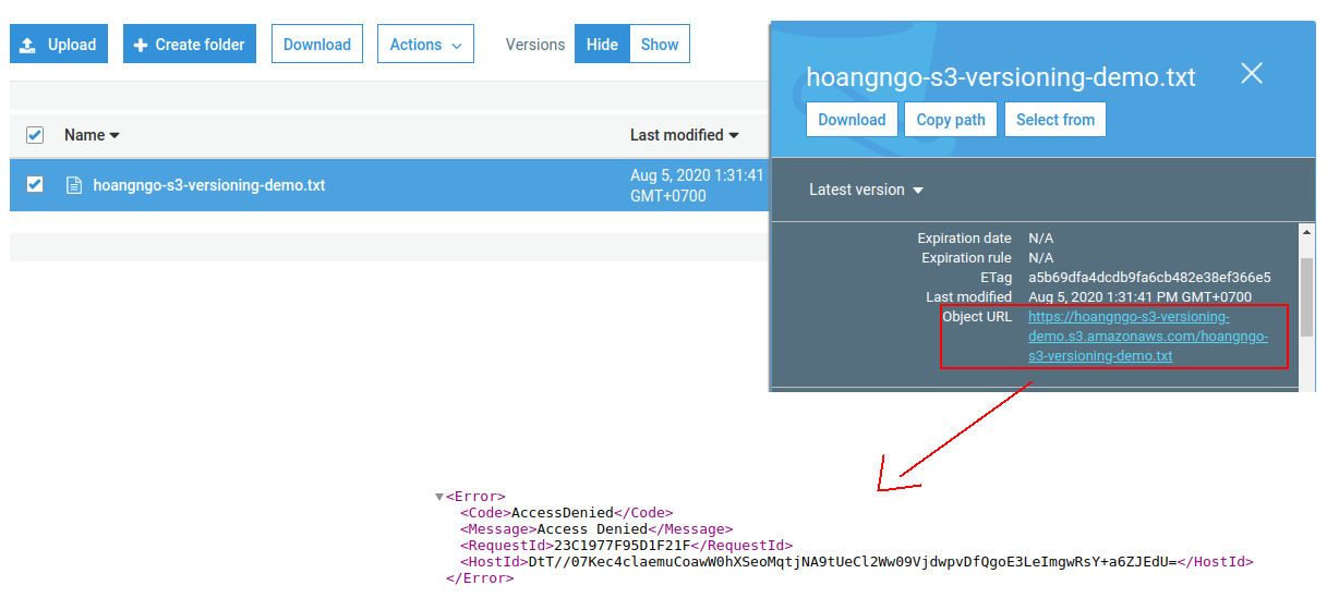 - Đúng như dự đoán, sau khi delete version (Delete marker) đi thì mọi thứ trở lại như trước khi delete.