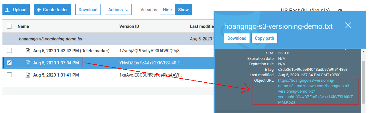 - Sau khi demo nhẹ nhàng như trên thì có lẽ nhìn vào hình bên dưới cũng đã có thể hiểu được versioning của S3 là như thế nào.