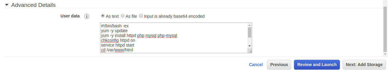- Ở phần Advanced Details cần copy và paste đoạn script bên dưới vào User data text box