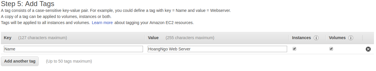 - Bỏ qua Step 4, ở Step 5 Add Tag như bên dưới
