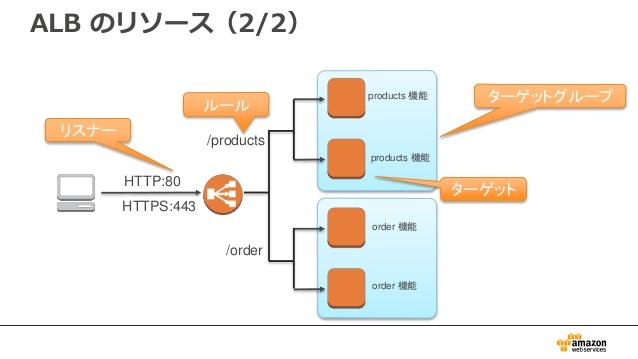 - ルール:ルールによってLBが一つ以上のTargetGroup内のTargetにRoutingする。
