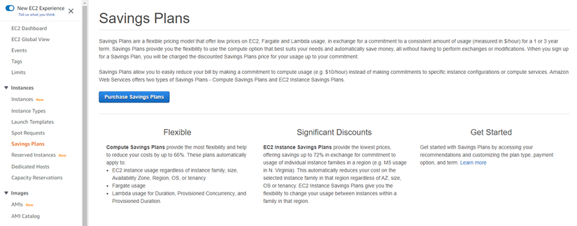 Để mua gói Saving Plans, ta vào tab EC2 - Saving Plans - Purchase Saving Plans :