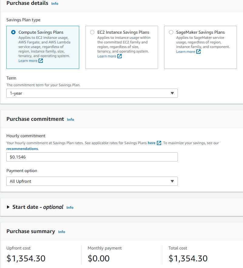 Vì vậy để có thể tính toán tiết kiệm chi phí nhất, Hourly Commitment nên được set một cách hợp lý. AWS cũng có thể recommend cho chúng ta rate gần chính xác nhất , các bạn tham khảo tại link recomendations ở phần nhập Hourly Commitment tại màn hình tính toán.