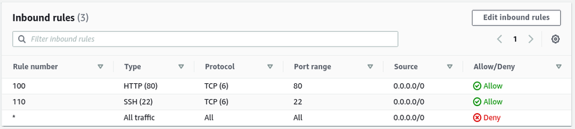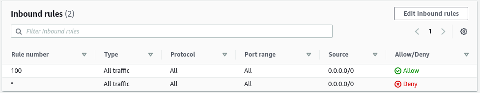 - Action: gồm hai loại cho phép (allow) và chặn (deny) Các quy tắc (rules) của NACL được xử lý theo thứ tự tăng dần của rule number, khi tạo NACL thì nó sẽ có một rule mặc định là chặn tất cả traffic và có rule number là ( * ) , đây là rule number lớn nhất nên sẽ được xử lý cuối cùng.
