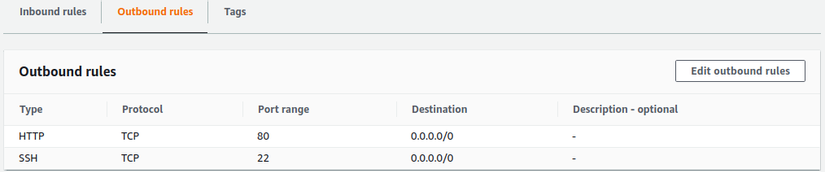 Outbound rule định nghĩa các traffic từ trong instance gửi ra ngoài thông qua ENI, tương tự inbound rule, outbound rule cũng có 3 giá trị