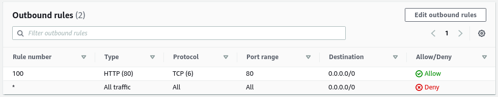 Các outbound rule định nghĩa các traffic nào được phép truy cập từ bên trong subnet ra ngoài, mỗi rule cũng chứa các thành phần giống với inbound rule.