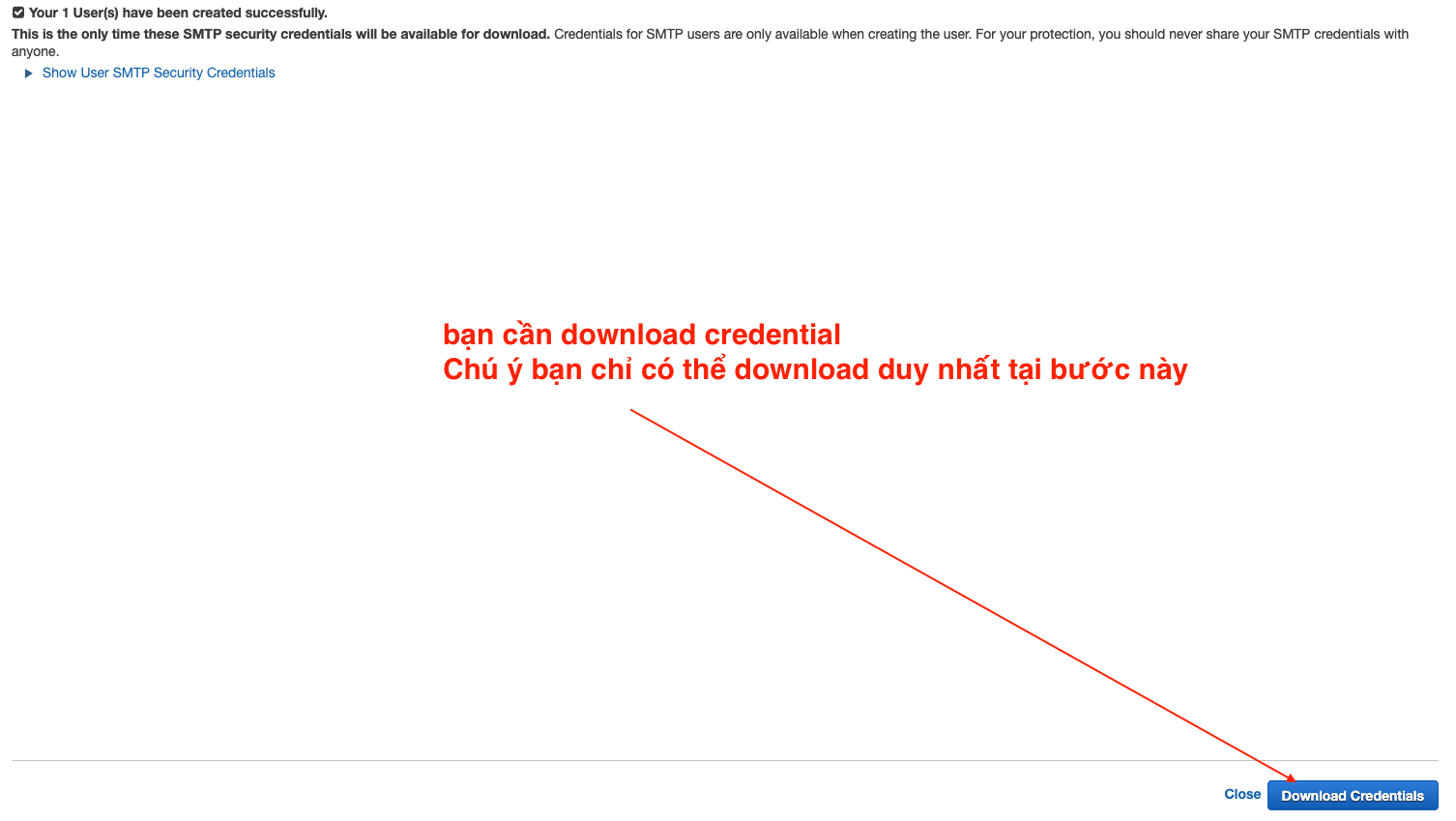 SES sẽ tạo ra một IAM user cho việc authenticate, để default vào click create