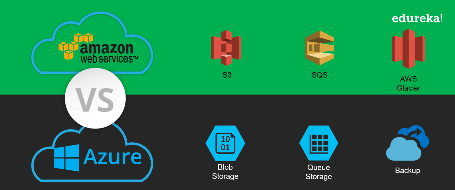 AWS có AWS S3, EBS và Glacier còn Azure Storage Services có Blob Storage, Disk Storage và Standard Archive.
