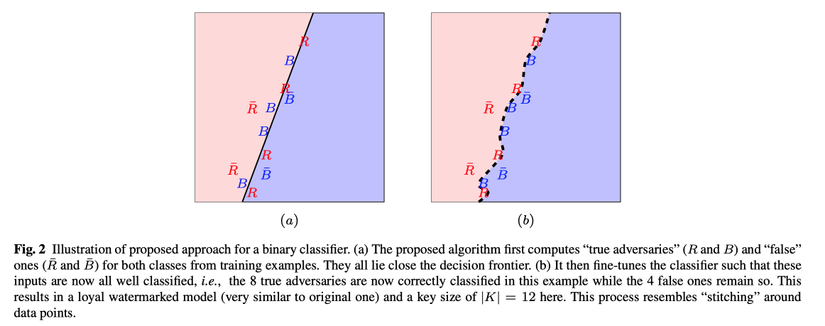 - Lý do sử dụng false adversaries là để giới hạn các thay đổi về kết quả của mô hình sau khi đã phân lớp đúng các true adversaries. Đồng thời, những adversaries đó sẽ ảnh hưởng tới hình dạng của đường biên phân lớp, làm cho mô hình chống chọi được với các vector tấn công: nếu watermark bị vô hiệu hoá thì hiệu năng của mô hình cũng sẽ giảm đi đáng kể.