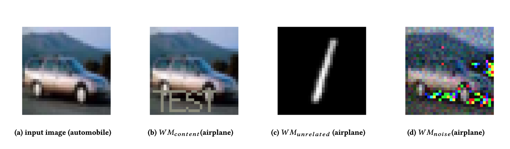- nhúng một watermark xác định trước (ví dụ: một chuỗi chữ cái hoặc in ẩn ảnh) vào dữ liệu có sẵn vào một class , và dạy mô hình nhận các ảnh đã nhúng đó ra một class khác.