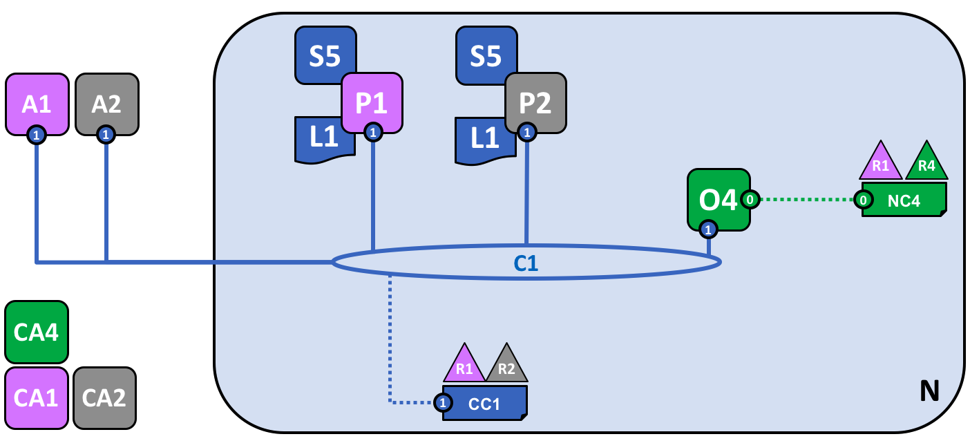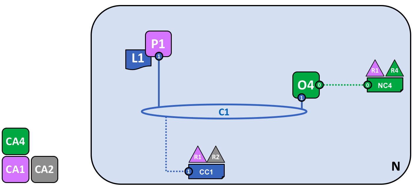 Khi P1 được start, nó có thể tham gia kênh C1 bằng cách gửi yêu cầu tham gia O4. Khi O4 nhận được yêu cầu tham gia này, nó sử dụng cấu hình kênh CC1 để xác định quyền của P1 trên kênh này. Ví dụ, CC1 xác định xem P1 có thể đọc và / hoặc ghi thông tin vào sổ cái L1 hay không.