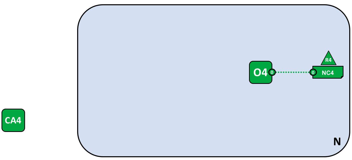 Hình trên là sơ khởi của một mạng N. Gồm có một Orderer Node O4, trên đó chạy một dịch vụ có tên là Ordering Services, tổ chức R4 nắm giữ quyền quản trị mạng N và thông tin này được lưu trong cấu hình mạng NC4, node CA4 có nhiệm vụ phát hành identity cho người dùng hoặc peer hoặc application đến từ tổ chức R4.