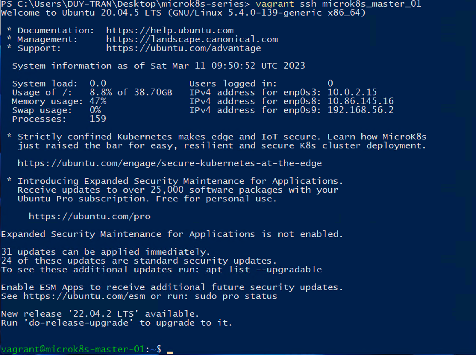Như vậy đã start thành công tiếp tục ta ssh vào máy microk8s-master-01 bằng lệnh