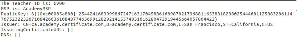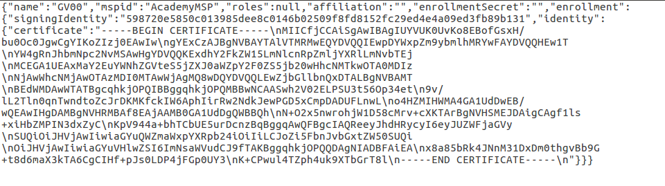 Các Certificate Authorities này sẽ cấp cho mỗi tác nhân muốn tham gia vào vào mạng một identity. Ví dụ khi bạn registerUser một user có id là 'GV00' với CA của một tổ chức Academy chẳng hạn: