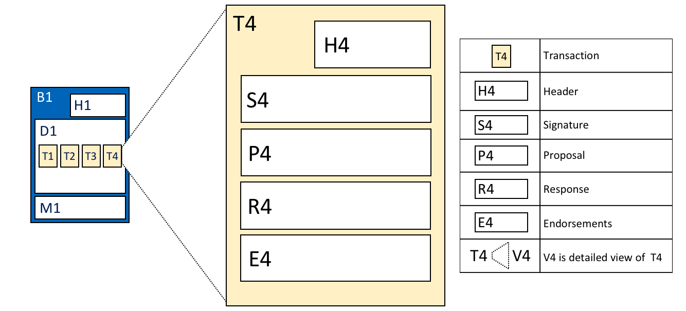 Một transaction T4 sẽ gồm có: Header H4, Signature S4, Proposal P4 ( đề xuất giao dịch ), Response R4 ( phản hồi giao dịch ), Endorsements E4 ( chứng thực giao dịch ).