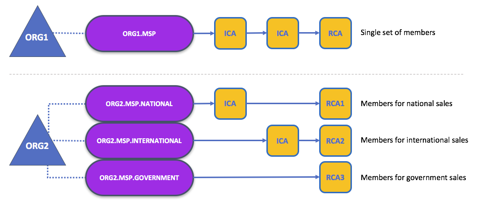 Ví dụ: tổ chức ORG1 có thể sẽ có một MSP được gọi là ORG1.MSP. Trong một số trường hợp, một tổ chức có thể yêu cầu nhiều tổ chức con - ví dụ: ORG2.MSP.NATIONAL, ORG2.MSP.INTERNATIONAL, ORG2.MSP.GOVERNMENT, phản ánh các nhóm thành viên khác nhau trong tổ chức ORG2.
