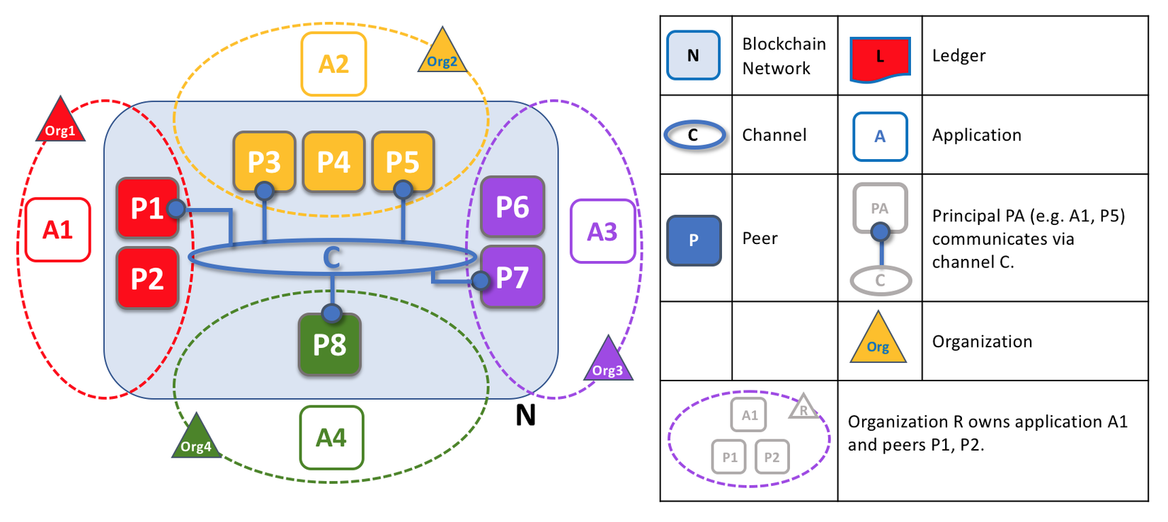 Trong ví dụ này, chúng tôi thấy bốn tổ chức đóng góp tám peer để tạo thành một network. Channel C kết nối năm trong số tám peer này vào network N - P1, P3, P5, P7 và P8. Các peer còn lại chưa được tham gia channel này, nhưng có thể đang tham gia ít nhất một channel khác.
