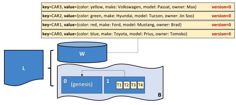 Chảng hạn như hình trên, trong Ledger L mới chỉ có 2 block, block đầu tiên là genesis block ( không chứa giao dịch ), block thứ hai là block chứa 4 giao dịch T1, T2, T3, T4 khởi tạo cho 4 chiếc xe CAR0, CAR1, CAR2, CAR3, và lúc này ở World State chứa trạng thái hiện tại của 4 chiếc xe ( color, model, owner ) và 4 chiếc xe đều được đánh version = 0 là mới nhất, có nghĩa là cả 4 chiếc này vẫn chưa có thay đổi gì về giá trị các thuộc tính.