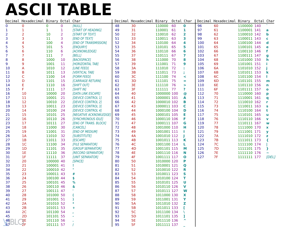 Sau đây là hình ảnh của bộ ký tự ASCII