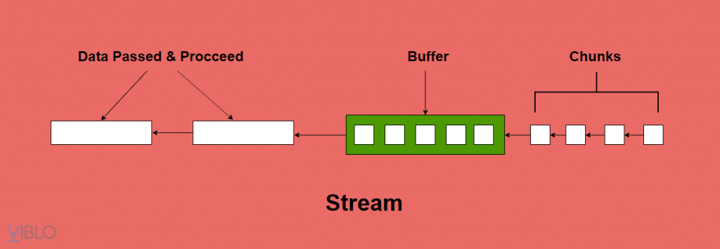 Stream có thể hiểu là 1 chuỗi những mảnh dữ liệu được lắp ghép lại với nhau để tạo ra dòng chảy dữ liệu và chúng được tách ra vận chuyển với một đoạn dữ liệu gọi là chunk. Chunk là 1 đoạn dữ liệu được truyền qua 1 stream, diữ liệu được cắt ra thành những mảng chunks và chuyển đi. Ví dụ, ta có 1 file có kích thước 128MB sẽ được tách ra thành 4 mảnh 32MB và chuyển đi