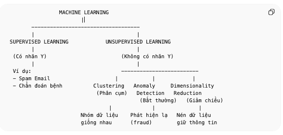 - Anomaly Detection (Phát hiện bất thường) Phát hiện các sự kiện lạ Ứng dụng: Phát hiện gian lận tài chính 💳 Giao dịch bất thường → có thể là lừa đảo