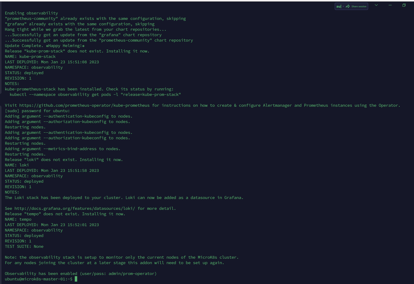 Sau khi ssh thành công ta kích hoạt addons observability bằng lệnh