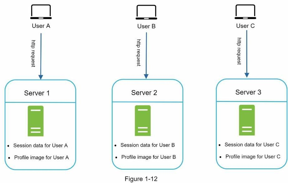 Trong hình trên, dữ liệu phiên của người dùng A và cả ảnh người dùng được lưu ở server 1. Để xác nhận người dùng A, các yêu cầu HTTP phải đến server 1. Nếu một yêu cầu đến server khác như server 2, yêu cầu sẽ nhận lỗi vì phiên của A không có ở server 2. Tương tự yêu cầu HTTP xác thực người dùng B phải đến server 2 và người dùng C phải đến server 3.