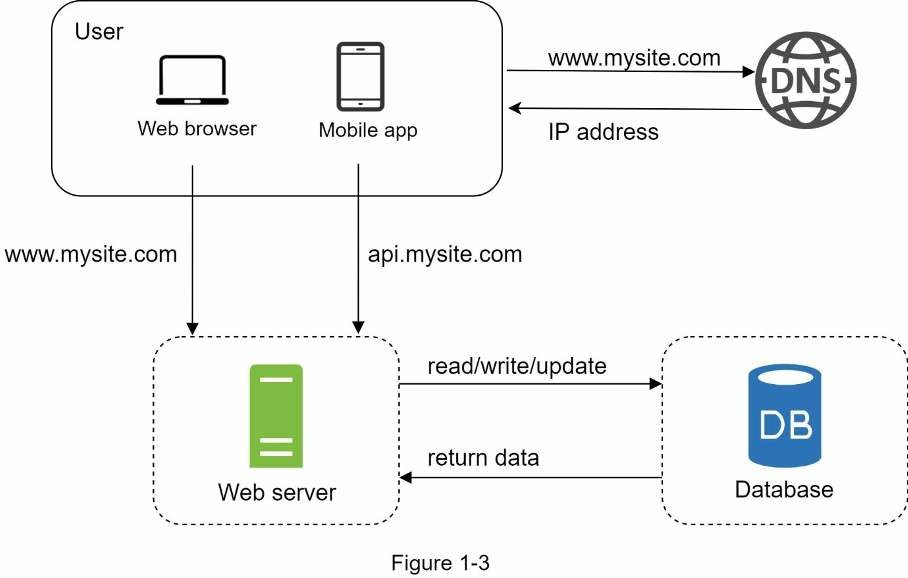 Hành trình vạn dặm nào cũng bắt đầu từ những bước đi đầu tiên, và thiết kế hệ thống cũng vậy. Khi bắt đầu, ta sẽ chạy tất cả mọi thứ trên một server duy nhất. Hình bên dưới minh hoạ việc thiết lập một server để chạy tất cả mọi thứ trên đó: ứng dụng web, cơ sở dữ liệu, cache,…