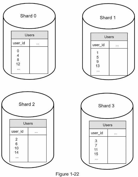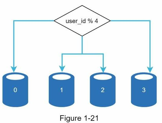 Ảnh dưới là ví dụ của cơ sở dữ liệu được shard. Dữ liệu người dùng được cấp phát từ server cơ sở dữ liệu dựa trên user ID. Bất cứ khi nào truy cập dữ liệu, hàm băm sẽ được dùng để tìm shard tương ứng. Trong ví dụ này, user_id%4 được dùng cho hàm băm. Nếu kết quả là 0, shard 0 được dùng để lưu và nạp dữ liệu. Nếu là 1, shard 1 được dùng. Tương tự với các shard khác.