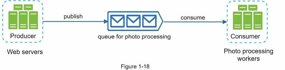 Theo dõi các trường hợp sau: ứng dụng của bạn hỗ trợ chỉnh sửa ảnh, bao gồm cắt, dán, đổi hình dạng, làm mờ,… Các tác vụ chỉnh sửa cần tốn thời gian để hoàn thành. Trong hình bên dưới, web server tải quá trình xử lý ảnh lên message queue. Worker xử lý ảnh nhận công việc từ message queue và thực hiện các tác vụ tuỳ chỉnh ảnh bất đồng bộ. Publisher và subscriber có thể được mở rộng quy mô một cách độc lập. Khi kích thước của queue trở nên lớn hơn, nhiều worker được thêm vào để giảm thời gian xử lý. Tuy nhiên, nếu queue trống trong hầu hết thời gian, số lượng worker có thể giảm.
