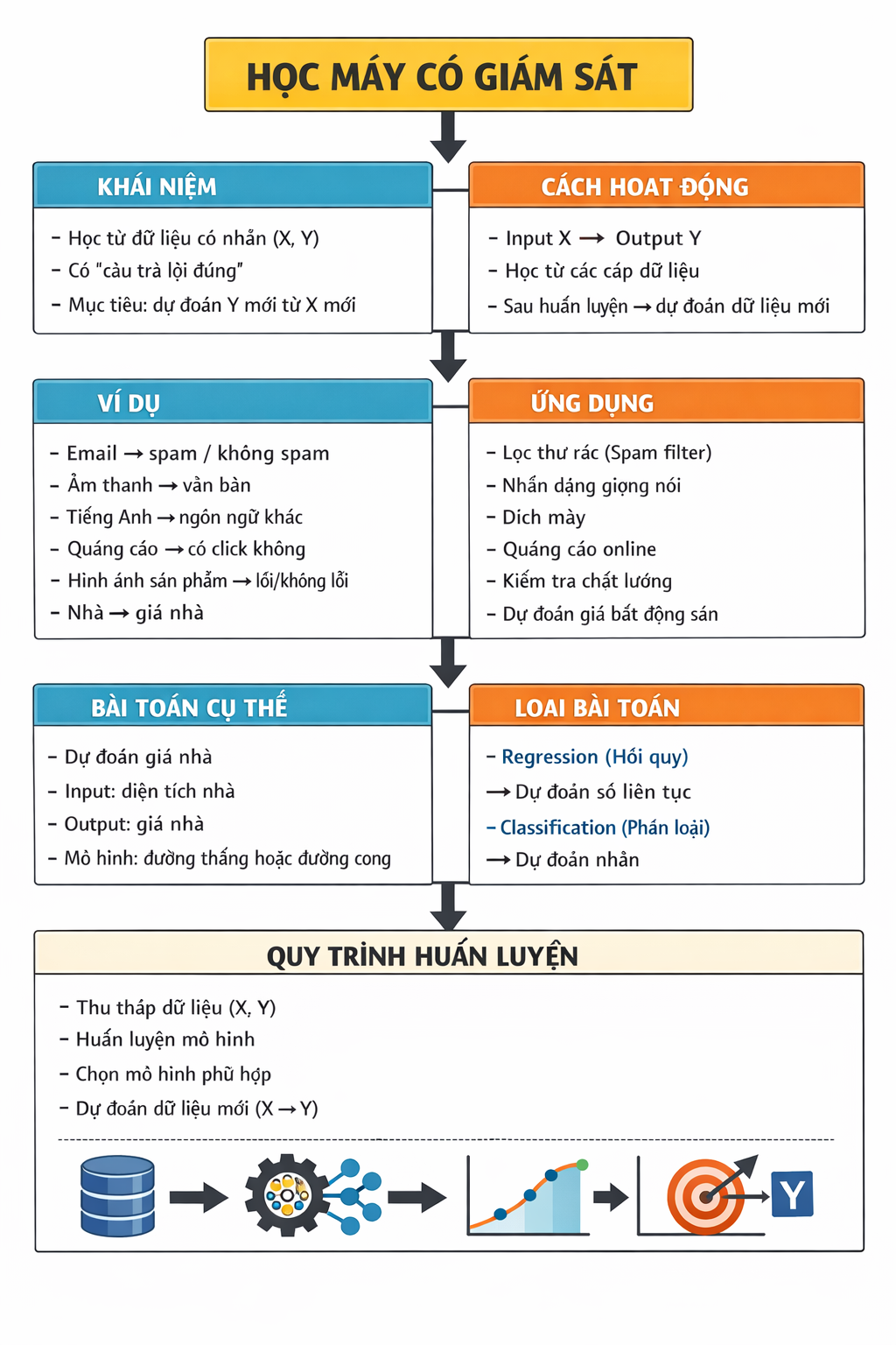 Trong tất cả các ứng dụng trên, ta đều huấn luyện mô hình bằng các ví dụ gồm đầu vào X và câu trả lời đúng Y. Sau khi học từ các cặp X-Y này, mô hình có thể nhận một đầu vào mới chưa từng thấy và dự đoán đầu ra tương ứng.