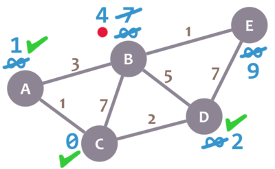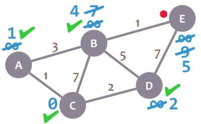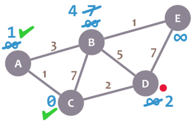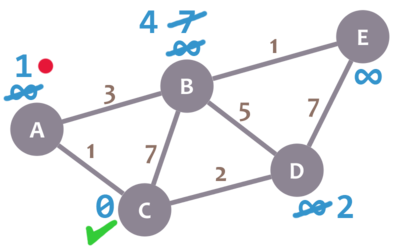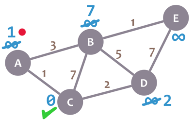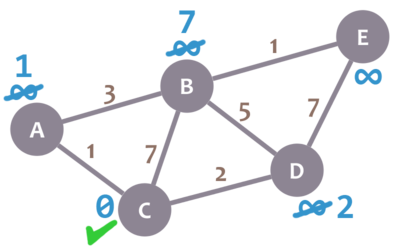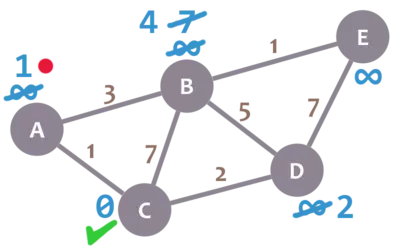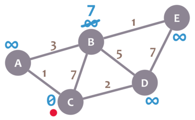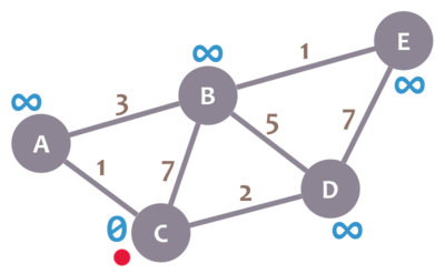 Trong quá trình thuật toán chạy, ta gọi cost(node) là khoảng cách ngắn nhất từ mỗi node đến node C và đánh dấu nó trên hình (giá trị số màu xanh da trời) . Khi thuật toán mới bắt đầu, ta mặc định lưu cost(C) = 0 , cost(A) = cost(B) = cost(D) = cost(E) = infinity.