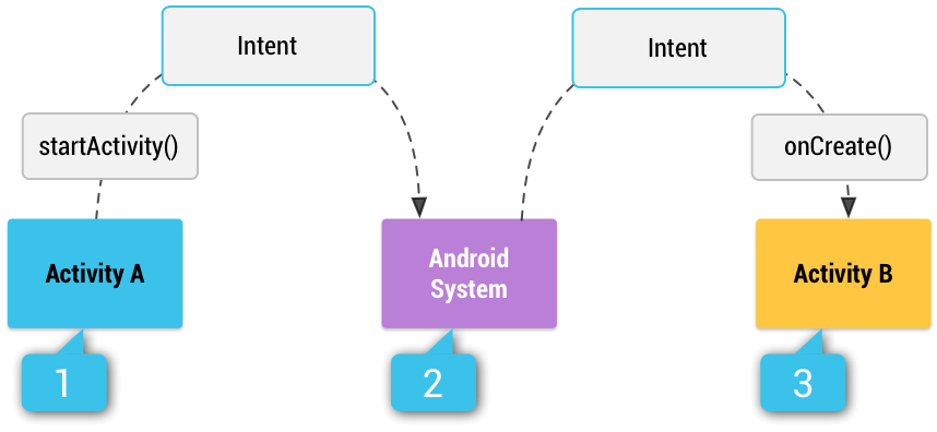 [3] khi tìm thấy kết quả khớp, hệ thống sẽ start Activity đó (Avtivity B) bằng lời gọi onCreate() và passing qua cho nó intent đc gửi từ activity A