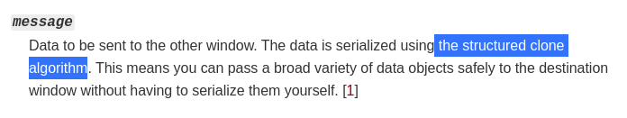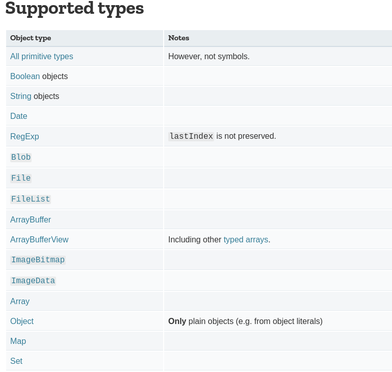 Nhưng vấn đề lớn hơn nữa đó là Object đó phải được hỗ trợ bởi HTML5 structured clone algorithm. Đó là lý do Object Error rất hoàn hảo và được phát hiện sớm nhưng không được sử dụng. Danh sách các Object cho postMessage được xác định là một phần của HTML5 structured clone algorithm.