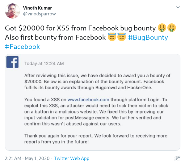 Lang thang trên Twitter đọc tin tức sau chuỗi ngày nghỉ lễ, bỗng thấy một Researcher đã có thâm niên nhiều năm đăng lên một lỗi XSS được Facebook trả $20,000 bounty.