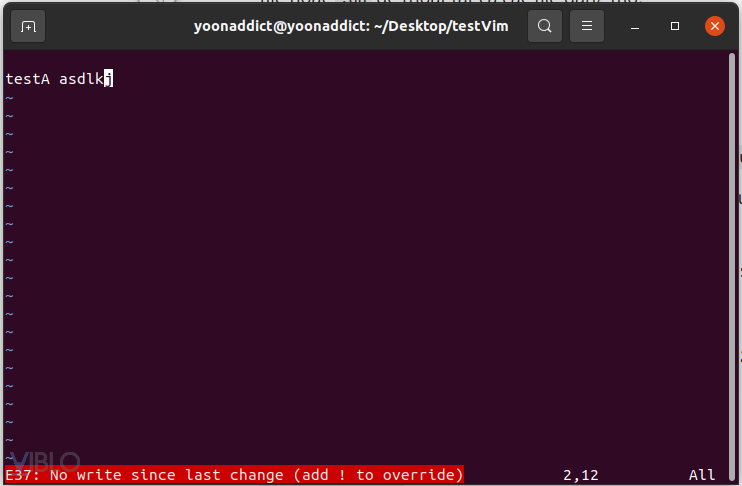 :w: lưu file mà ko thoát file:wqhoặc:x: lưu và thoát file:q: thoát file:q!: thoát mà không lưu file (nếu bạn sửa file mà chưa:wđể lưu mà dùng:qthì sẽ có thông báo như ảnh bên dưới, hoặc là bạn lưu lại rồi mới thoát, hoặc dùng:q!để thoát mà không lưu lại những thay đổi này)