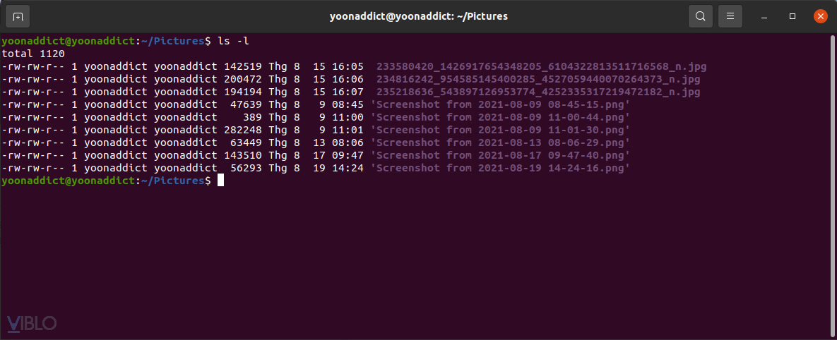Đến đây thì chắc các bạn đã đoán được ý nghĩa của con số 7 rồi đúng không nào (nó chính là tổng của 3 con số trên, tức là toàn bộ quyền đọc, ghi và thực thi), quá quyền lực phải không. Nhưng tại sao lại là 777 thì chúng ta hãy tiếp tục đến với cách kiểm tra quyền hiện tại của file nhé. Nếu các bạn đã quen với câu lệnh ls để liệt kê danh sách file/folder thì chỉ cần thêm tùy chọn -l để xem được chi tiết phân quyền như sau: